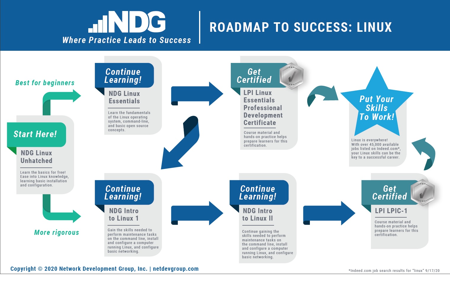Ready to go from zero to hero? Let our roadmap guide the way! With flexible options along the journey, NDG’s Linux courses will prepare you to get certified and put thousands of job opportunities within your reach. Start on your path today.